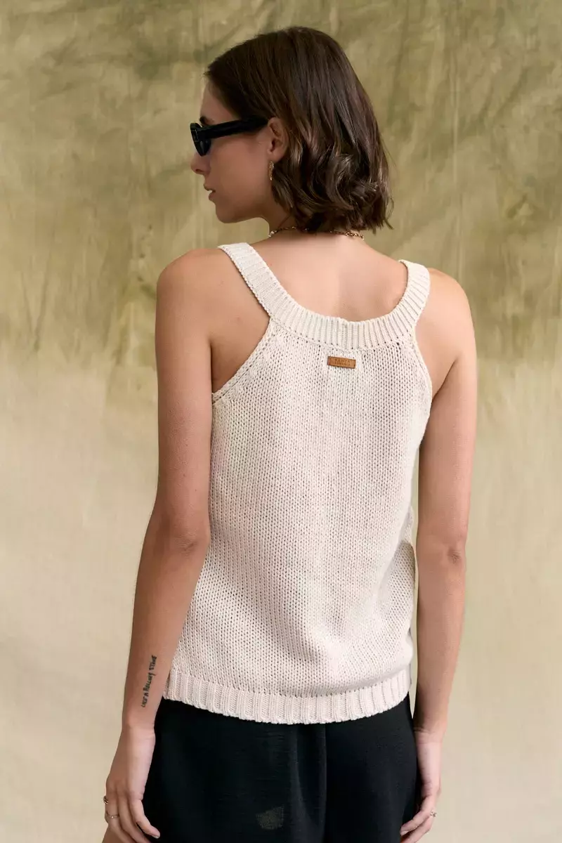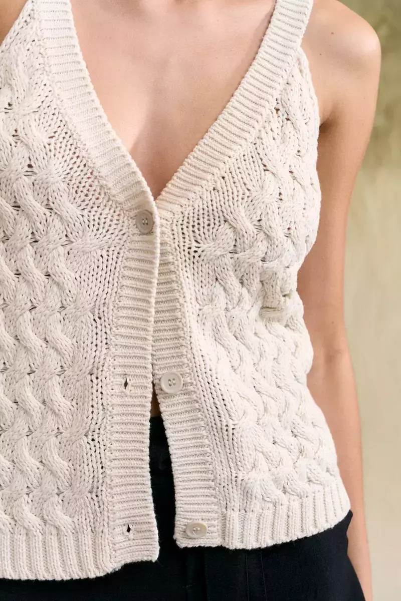 Chaleco tejido 100% algodón, con botones a tono en el delantero. Modelo suelto con escote en V. La modelo usa talle S. Medidas talle S: Contorno de pecho: 74cm/ Largo total: 57cm