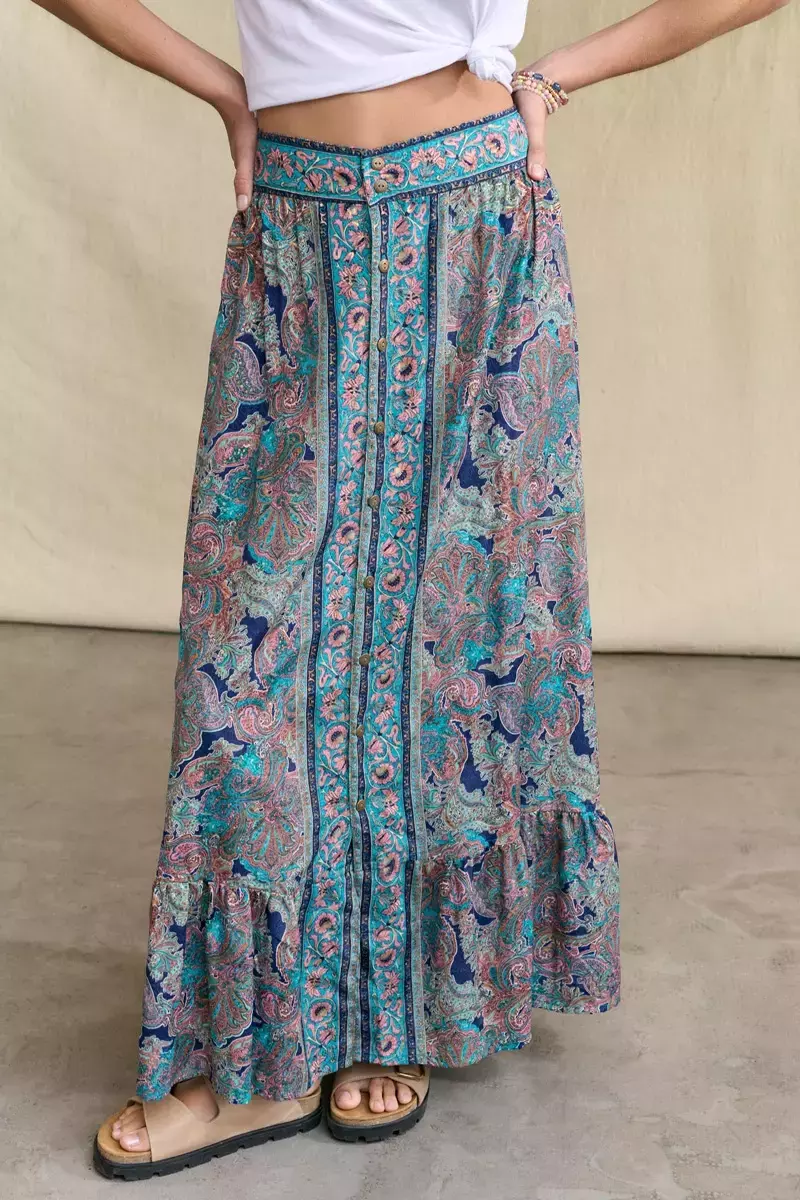 Falda larga confeccionada en seda Sari estampada, con hilos dorados propios del género. Espalda con cintura elastizada y cartera con botones en el delantero. Modelo de muy buena caída. Posee recortes con frunce a lo largo de todo el recorrido de la falda, que le otorga mayor amplitud a la prenda. Producto importado de la India. La prenda viene dentro de una bolsita confeccionada en la misma misma seda Sari. La modelo usa talle S/M. Medidas talle S/M: Largo total: 98 cm / Contorno de cintura: 64 cm