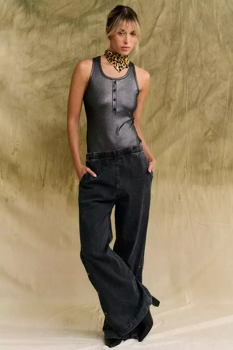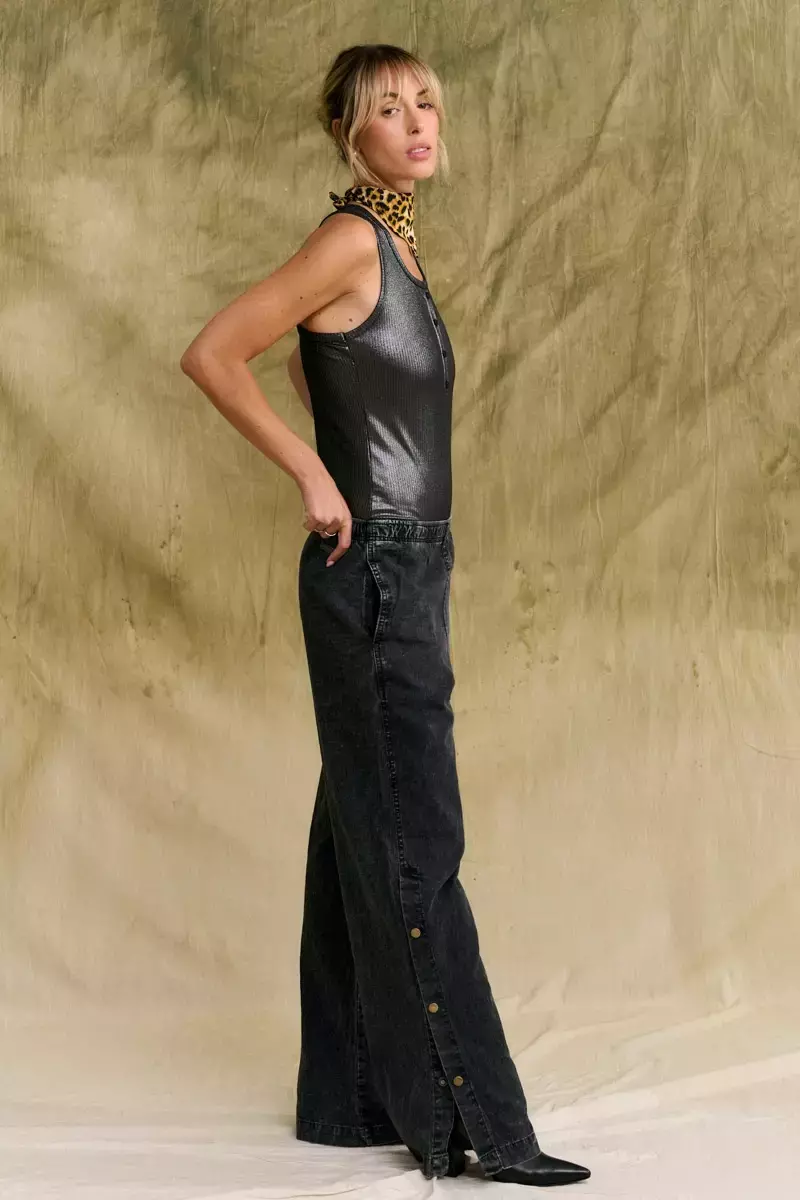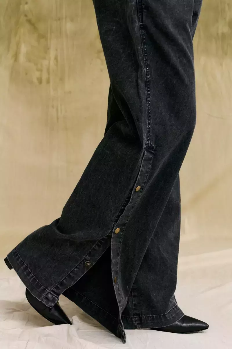 Palazzo con cintura elastizada, realizado en denim liviano 100 % algodon. Color negro desgastado. Modelo tiro medio y bolsillos en los laterales. Pierna amplia y suelta. A los costados se puede abrir mediante broches metalicos. La modelo usa talle 24.