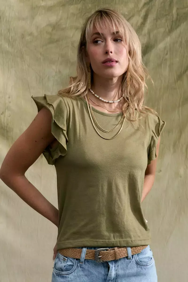 Remera manga corta confeccionada en jersey de algodón. Posee cuello redondo. Mangas con volados. Modelo al cuerpo. La modelo usa talle Small. Medidas talle S: Largo total: 57 cm / Contorno de pecho: 80 cm / Ancho de hombro: 6,5 cm / Largo de manga: 10 cm.