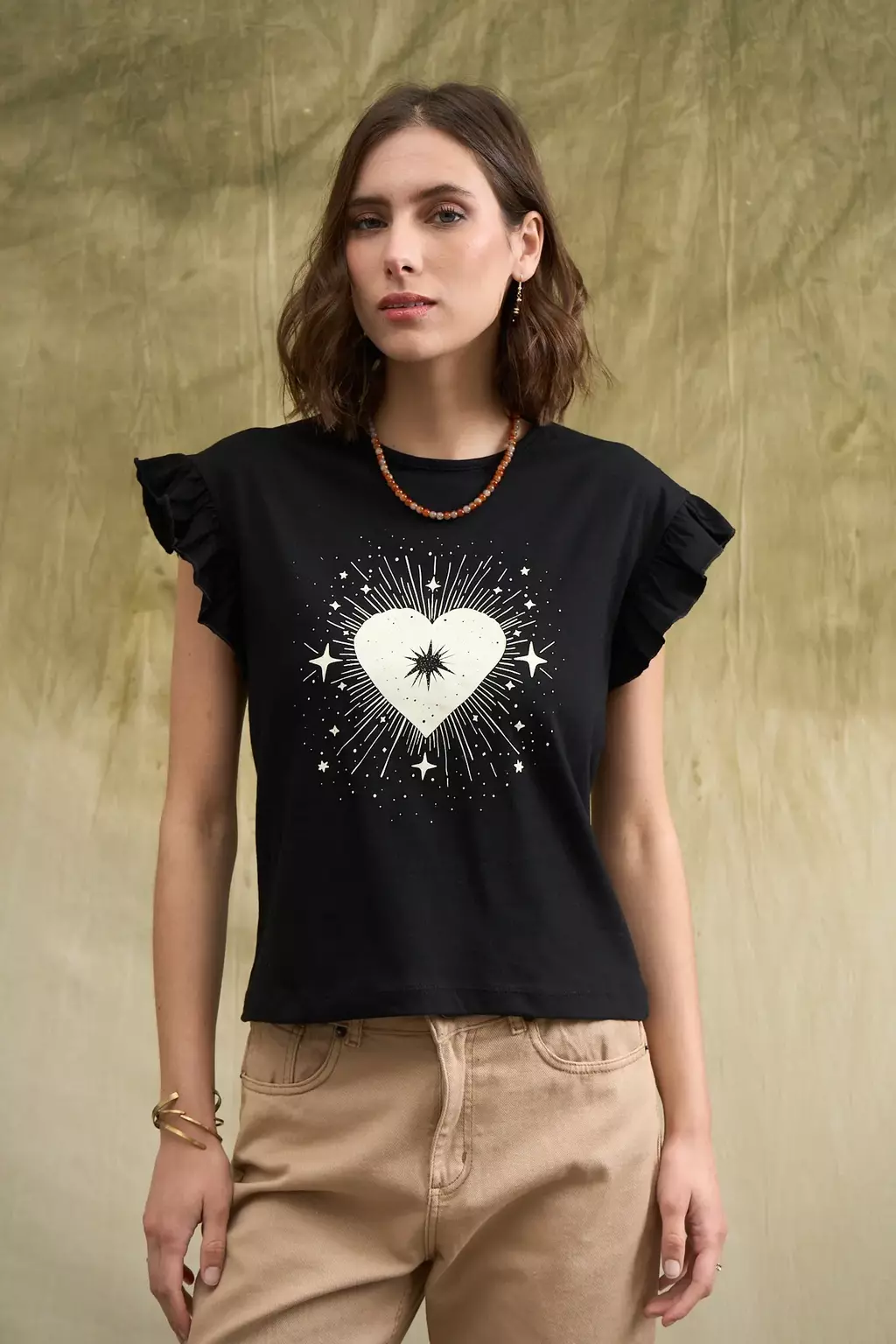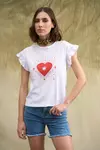 Remera de jersey de algodón con volados en mangas y estampa centrada en delantero. La modelo usa talle small. Las medidas de una prenda talle small son: contorno de pecho: 88cm/ largo: 55cm