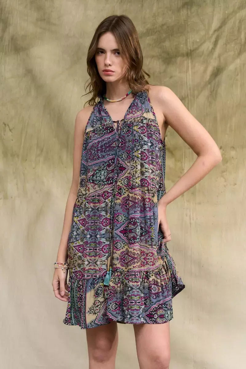 Vestido corto confeccionado en seda sari estampada. Tiene cuello mao con frunce, y escote en V con tiras para anudar, y terminaciones de flecos con cuentas doradas. No posee mangas. La prenda viene dentro de una bolsita confeccionada en la misma tela. La modelo usa talle S/M. Las medidas de una prenda talle S/M son: Contorno de pecho: 114cm/ Largo: 98cm Producto importado de la India.